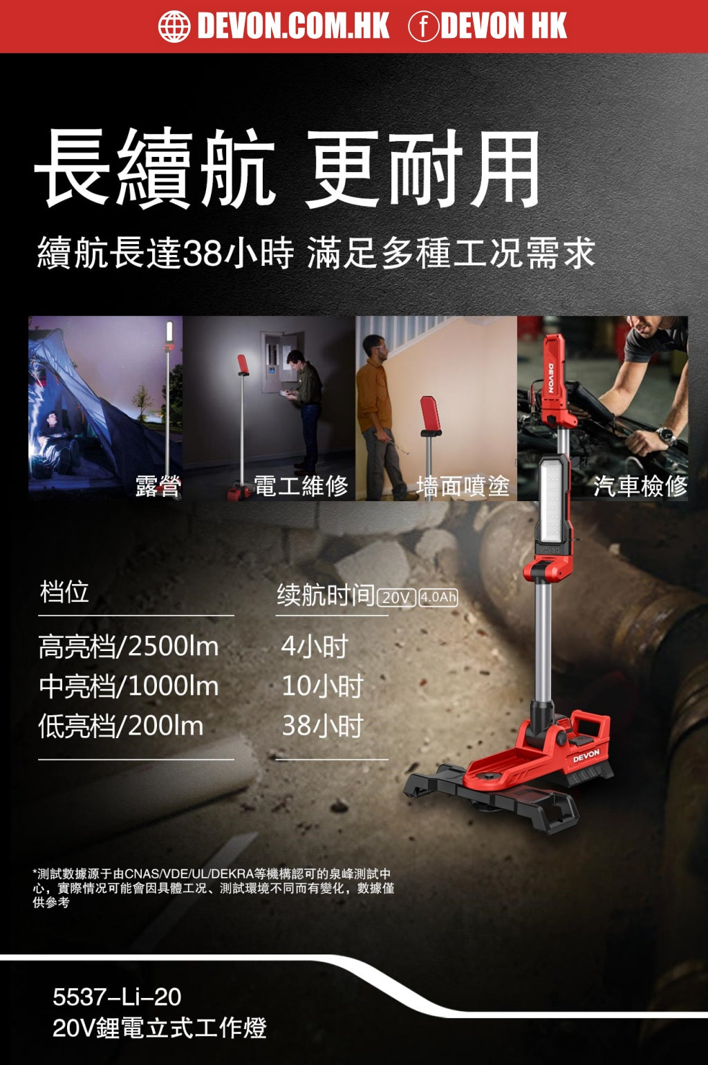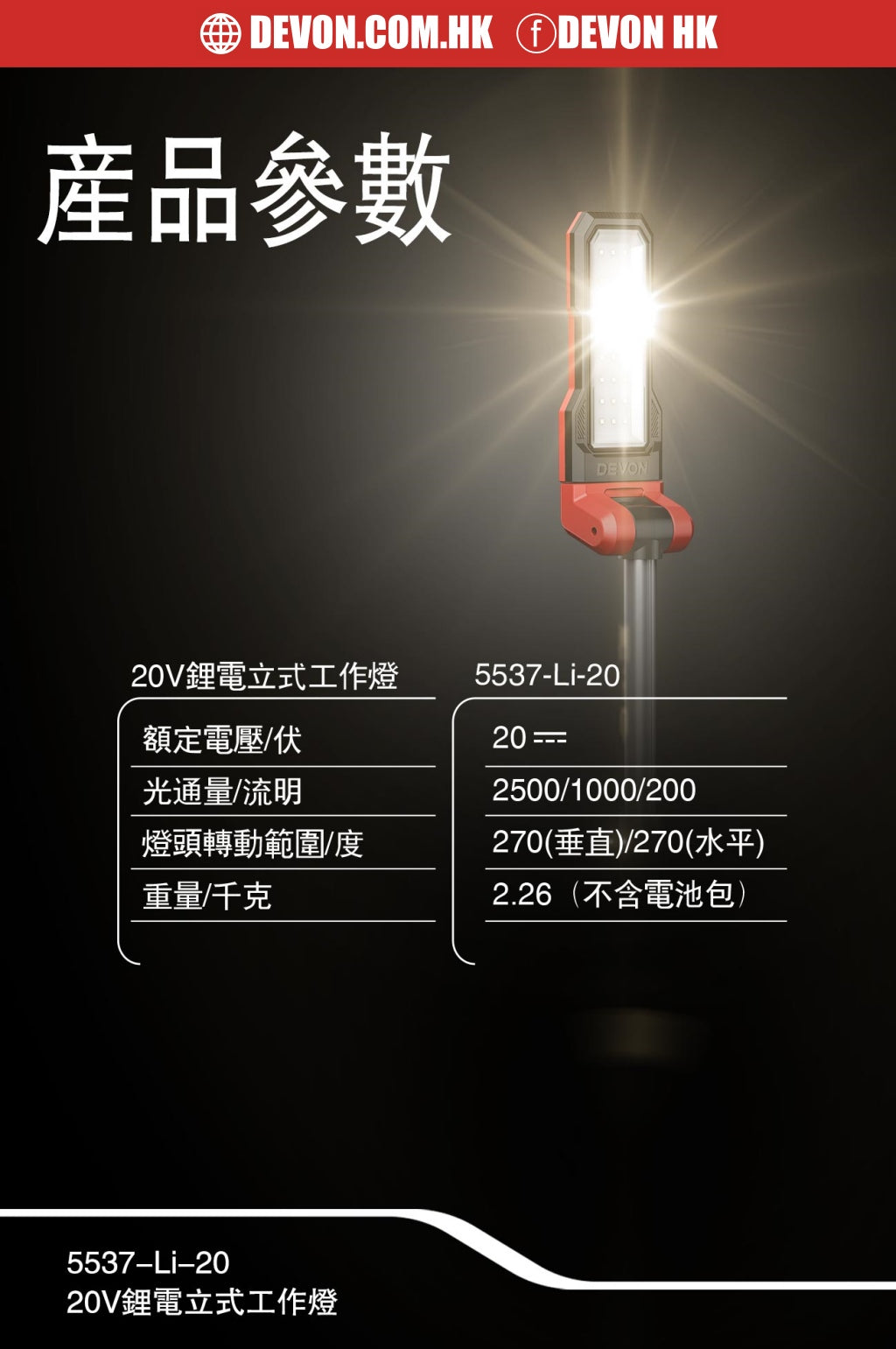大有DEVON 立式工作燈(2500流明)(鋰20V)(淨機) 5537-Li-20