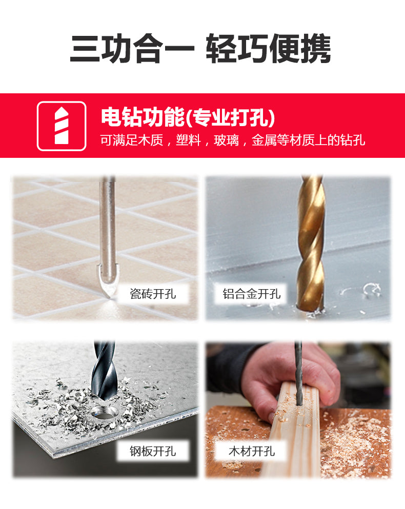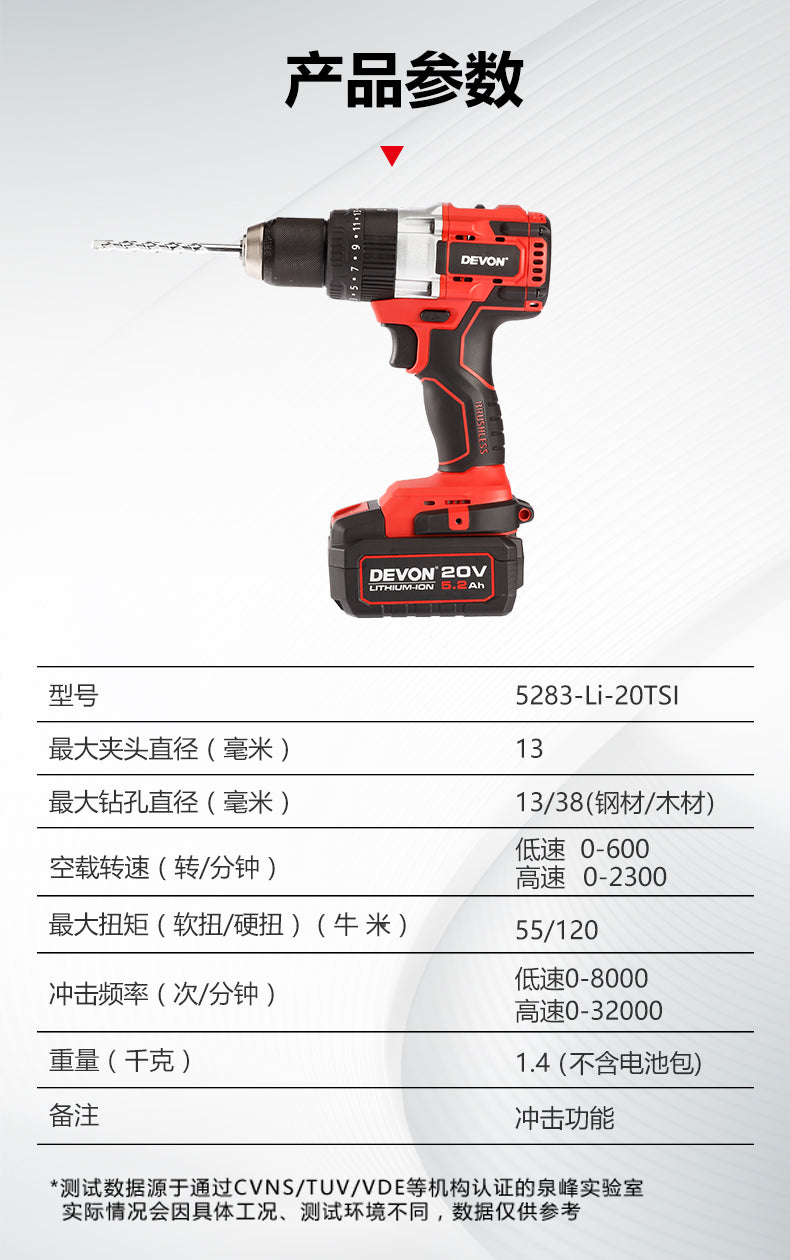產品特點 扭力杯調節適應不同的工作需求 機械雙速高速鉆削與低速緊固的完美組合 LED 工作燈狹窄空間高度照明 無刷電機強勁動力,提高工作效率 全軟膠防護機身軟膠防護設計,抗跌落和沖擊 規格參數 5283-Li-20TSI 電壓 (V) 20 電機類型(有刷/無刷) 無刷 空載轉速(rpm) 低速 0-600 高速 0-2300 衝擊頻率(次/分鐘) LOW 0-9600 HIGH 0-368000 最大夾頭直徑(毫米) 13 木材最大鑽孔直徑(毫米) 68 金屬最大鑽孔直徑(毫米) 13...